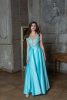 Необыкновенно женственное платье, выполненное из шелковистого атласа и кружевных фрагментов. Юбка максимальной длины дополнена широким поясом, который завязывается на спинке на широкий бант, а лиф платья выполнен из тончайшей, почти невидимой сетки, которая декорирована кружевными цветами. Вышивка на спинке приковывает взгляд – здесь она особенно воздушная и деликатная. Кроме того, чашечки кружевных цветов вручную украшены миниатюрными кристаллами.