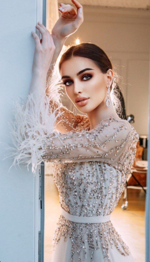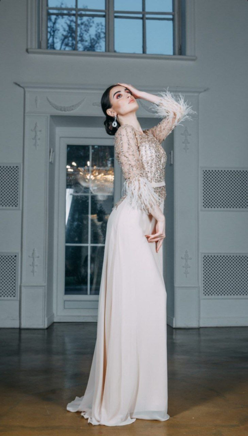 Перья на рукавах придают легкости этому расшитому бисером лифу и струящемуся шифоновому платью с юбкой А-силуэта.