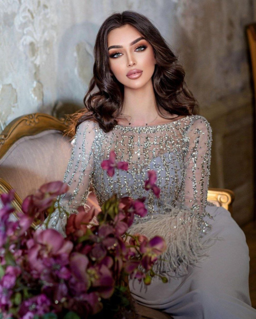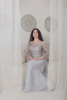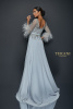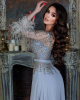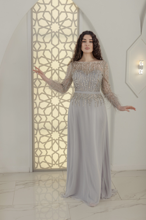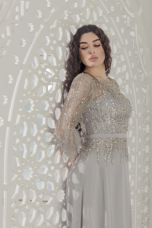 Перья на рукавах придают легкости этому расшитому бисером лифу и струящемуся шифоновому платью с юбкой А-силуэта.