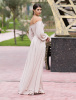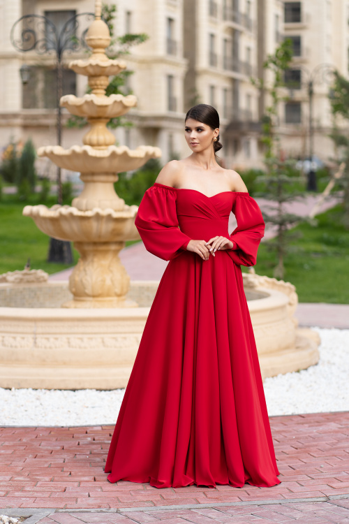 Универсальный вариант платья, подходящий для любого рода праздничных мероприятий. Пышный рукав и оголенные плечи делают талию еще более изящной, а юбка свободного кроя, развеваясь на ветру, соблазнительно приоткрывает ножку. А если смущаетесь открывать верх, то можно накинуть на плечи рукава-трансформеры