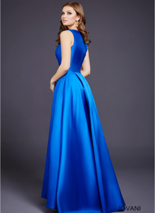 Роскошное вечернее платье JOVANI 33641 A насыщенного синего цвета. Платье выполнено из атласа, имеет немного укороченный подол юбки спереди и небольшой шлейф сзади. Глубокий вырез декольте прикрыт тонкой полупрозрачной тканью и уравновешен закрытой спинкой. Это элегантное платье подчеркнет изящность и вкус его владелицы.