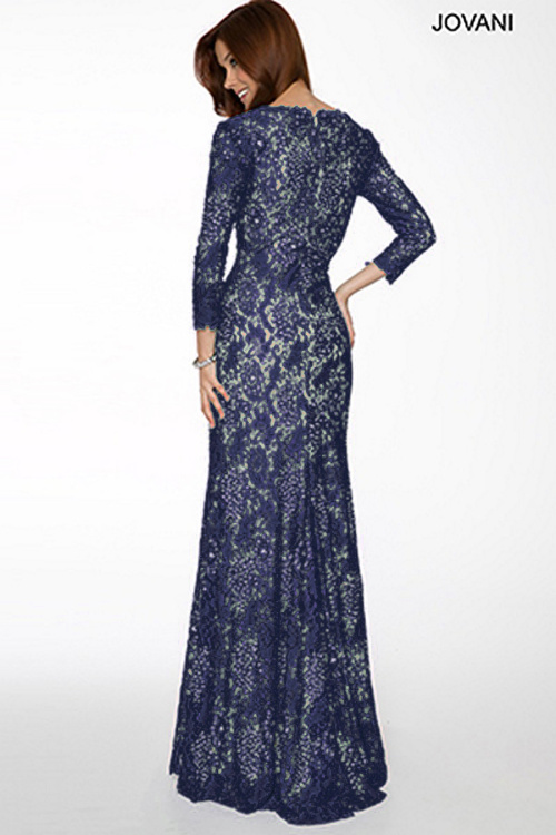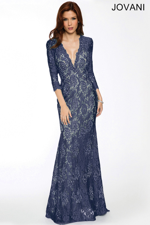 Облегающее вечернее платье в пол Jovani 20025 A. Кружевное платье, по всей длине расшито стразами. Соблазнительный глубокий V - образный вырез, рукав 3/4, имеется небольшой шлейф. Платье представлено в насыщенном синем цвете.