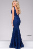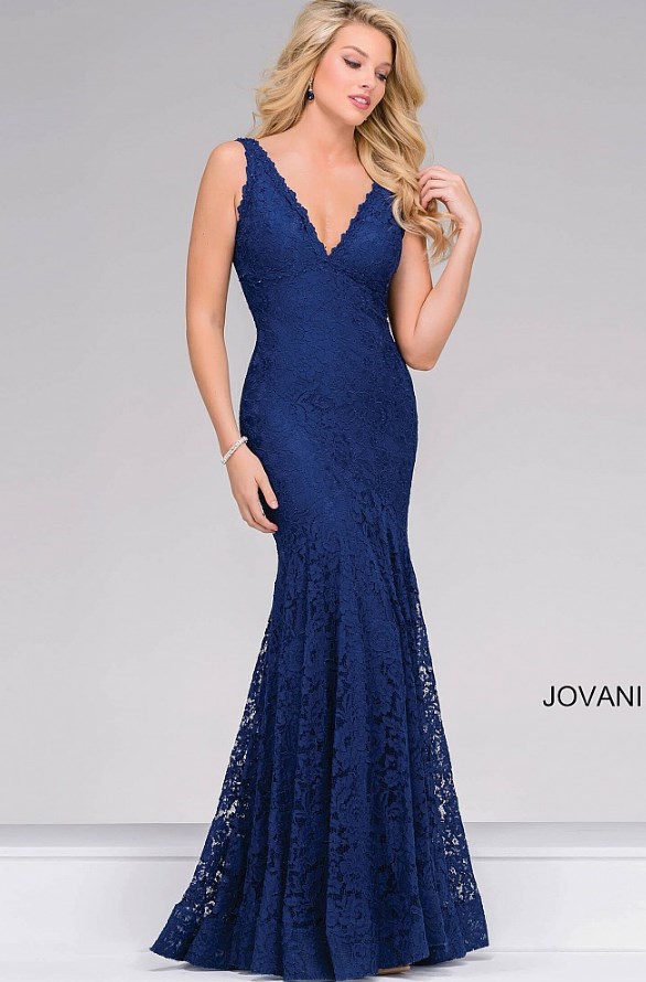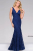 Длинное вечернее платье на бретелях в пол Jovani 33050 A. Платье фасона " годе" выполнено полностью из кружева. V- образный вырез украшает спину и область декольте, имеется небольшой шлейф.