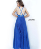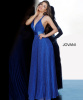 Это торжественное платье синего сапфирового и бронзового цвета Jovani выполнено из плиссированной блестящей ткани с бисером в тон на глубоком вырезе с бретелькой через шею и крест-накрест на спине. Широкий пояс с бусинами из стекляруса подчеркивает А-образный силуэт.