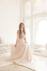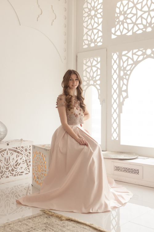 Бесподобное сочетание романтичного розового персика придаёт этому платью несомненный шарм. Топ из эластичной сетки и фантазийный кружевной декор, дополненный цветами и кристаллами. Ну а юбка платья просто незабываема – максимально длинная, она имеет красивый трапециевидный силуэт и глубокие складки, подчёркивающие стройность вашей фигуры!