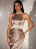 Это эффектное длинное платье из струящегося атласа идеально подойдет для вечерних летних выходов. Вырез американка подчеркнет хрупкие плечи, драпировка сделает акцент на изгибах вашего тела, а юбка с запахом позволит продемонстрировать красоту ног