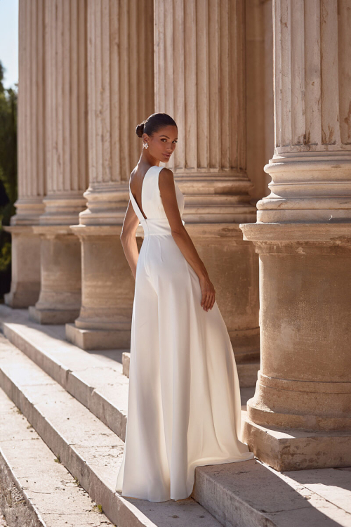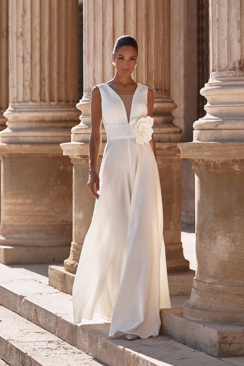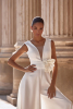 Длинное волшебное платье А-силуэта из шифона . Декольте оформлено глубоким V-образным вырезом, прикрытым тонкой фатиновой вставкой. Широкие удобные бретели закрывают плечи, оставляя верх спинки открытым. Ниже сзади находится скрытая молния. Талия акцентирована широким поясом и объёмным цветком сбоку. Длинные брюки представлены широким кроем