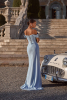 Длинное блестящее платье силуэта «рыбка». Декольте оформлено прямым вырезом с приспущенными бретелями. Корсет утягивается атласной лентой на спинке. Лёгкая драпировка лифа плавно переходит на длинную юбку с запахом. Эффектный разрез сбоку и небольшой шлейф создают очаровательный образ.
