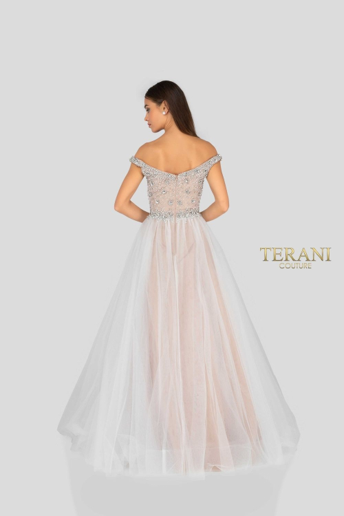 Выразите свою яркую индивидуальность в этом прекрасном вечернем платье от Terani Couture 1911P8543. Сверкающие хрустальные бусины украшают облегающий лиф, увенчанный вырезом со спущенными плечами и широкой V-образной спинкой, открытой посередине. Потрясающие складки струятся каскадом по тюлевой юбке бального платья, ниспадающей до полной длины. Это платье от Terani Couture — идеальный выбор для девушки, которая хочет выглядеть привлекательно, но не вызывающе.