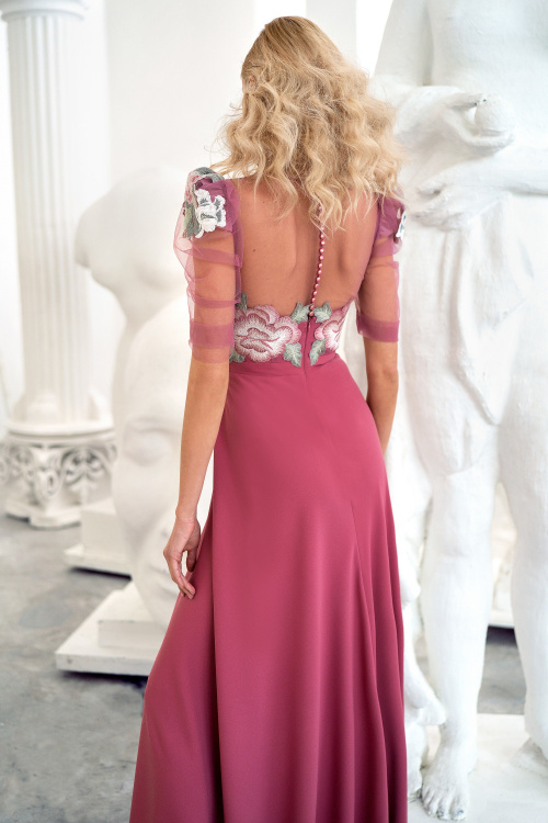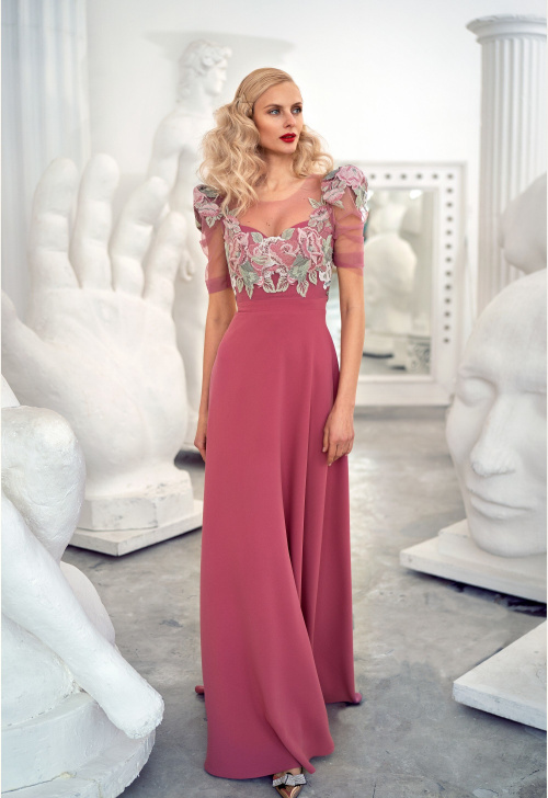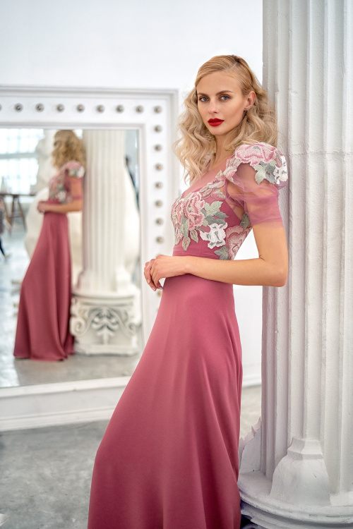 Цветочное вечернее платье для абсолютно любого мероприятия. Утонченный фасон прямой юбки ненавязчиво облегает бедра, а прозрачные рукава 3/4 имитируют легкую шаль.