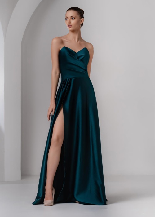 Необычайно женственное платье бюстье с острой линией кроя по лифу из магнуса. Длинная юбка на запах свободного кроя дополняет образ, а шнуровка по спинке делает максимально идеальную посадку. Открытые плечи, декольте, интригующе подчеркивающее грудь – все это утонченно обыграно, выглядит сногсшибательно и изыскано.