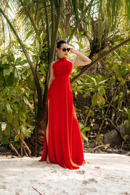 Вечернее длинное платье из шелк-плазмы. Трехслойный лиф с американской проймой, открытая спина и высокий разрез по ноге – идеальное сочетание для торжественного образа.